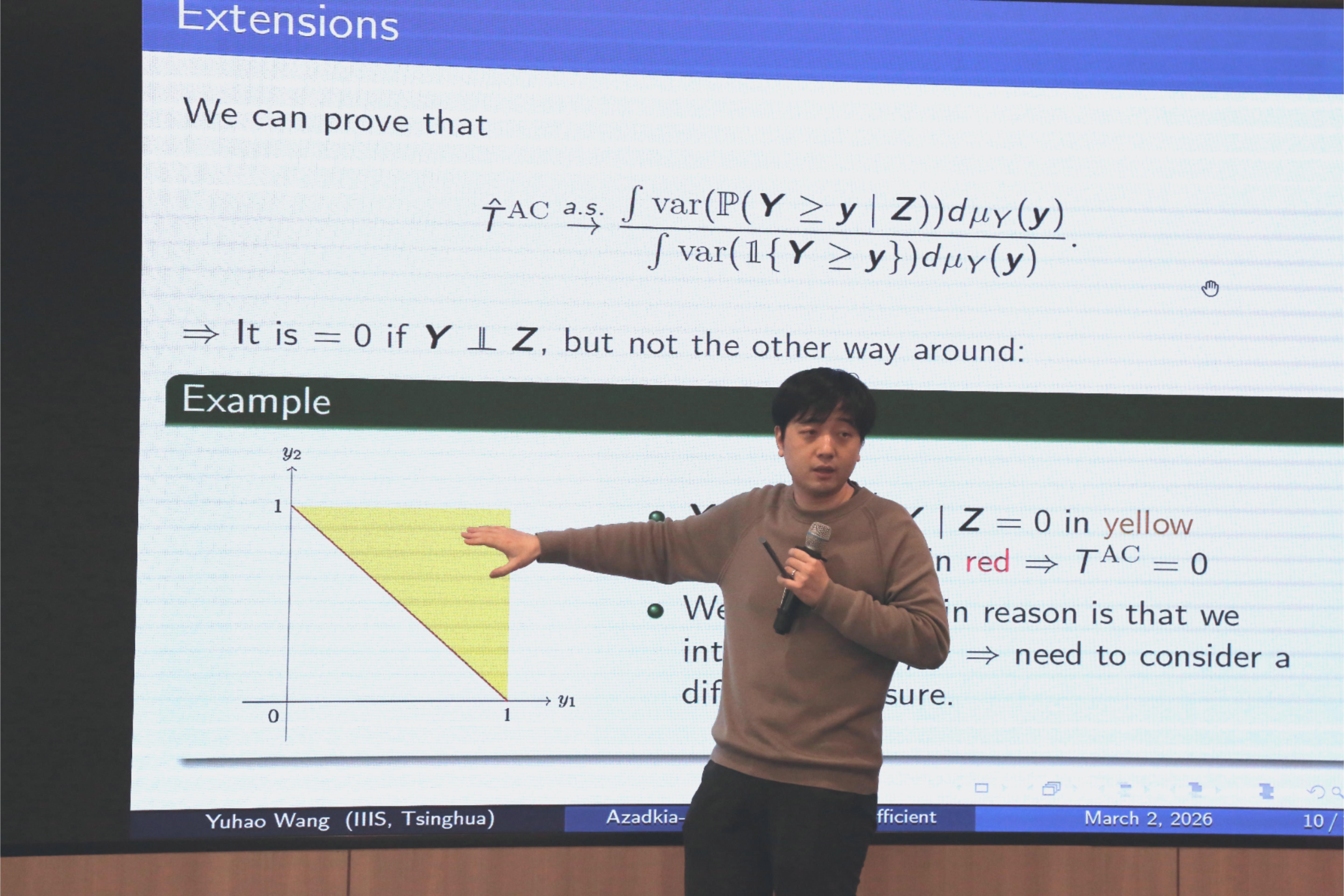 2026年3月3日,清华大学交叉信息研究院王禹皓助理教授访问我系,并作学术报告,报告的题目是A multivariate extension of Azadkia-Chatterjee's rank coefficient。